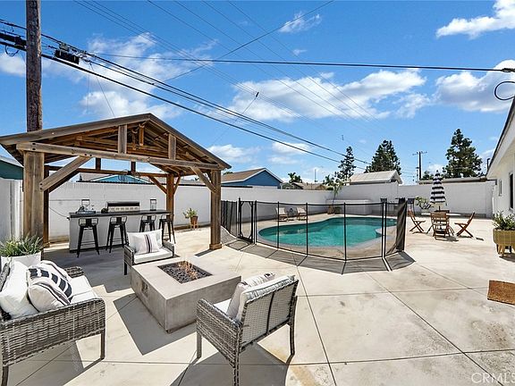 Welcome Home to this Absolutely Stunning, Beautifully Upgraded Huntington Village Pool Home that has been Expanded to 1,502 Square Feet with the Addition of a 400 Square Foot Bonus Room/4th Bedroom and a Redone Entertainer's Dream Backyard that is a Resort-Style Oasis with its Sparkling Pool with Child Safety Fence, and Newer Pump & Heater, Newer Scored Concrete Decking with Multiple Sitting Areas, a Built-In Barbecue Center with Tile Countertop, Bar Seating, and Refrigerator under a Beautiful Gazebo with Cathedral Ceiling, a Tavola Fire Coffee Table for Warming Your Hands on Cooler Evenings, Block Wall Fencing for Privacy, and Even a Lemon Tree for Making Your Specialty Drinks. This Paradise Backyard is the Perfect Blend of a Relaxing Outdoor Living Space and Memorable Gatherings to Host Friends and Family. Located in a Highly Desired Neighborhood, Close to Huntington Harbour, Beach, Award-Winning Schools, Meadowlark Golf, and Bella Terra. This Lovely Home Boasts Beautiful Curb Appeal with Professional Landscaping, New Exterior Paint 2024, Newer Roof 2019, and Private Gated Courtyard Entry. Step Inside to the Open Concept Floorplan with New Paint, Newer Central A/C with Nest Thermostat, Beautiful Plank-Style Wood Vinyl Flooring, Dual Pane Windows, Raised Panel Interior Doors, Newer Dual Pane Sliders, Ceiling Fans, a Fireplace in the Living Room, Spacious Dining Area Open to an Upgraded Kitchen with Granite Countertops, Custom Solid Wood Cabinetry, and Gas Range w/New Vent Hood. Both Bathrooms are Remodeled with Newer Quartz Vanities, New Fixtures, and Marble Flooring. The Primary Suite Bathroom Features Chic Art-Deco in Flooring and Shower Surround Design, Plus Clear Glass Shower Door. The Hall Bath has a Tub/Shower Combo with Subway Tile Surround. Additional Features Include a Newer 200 AMP Electric Panel 2018, Recessed Lighting in the Bonus/4th Bedroom, Sprinkler System in Front Yard, and a 2 Car Direct-Access Garage with Washer & Dryer Hook-Ups. Newer main sewer line 2019