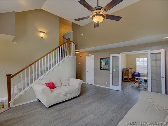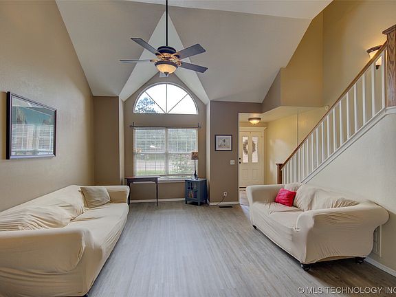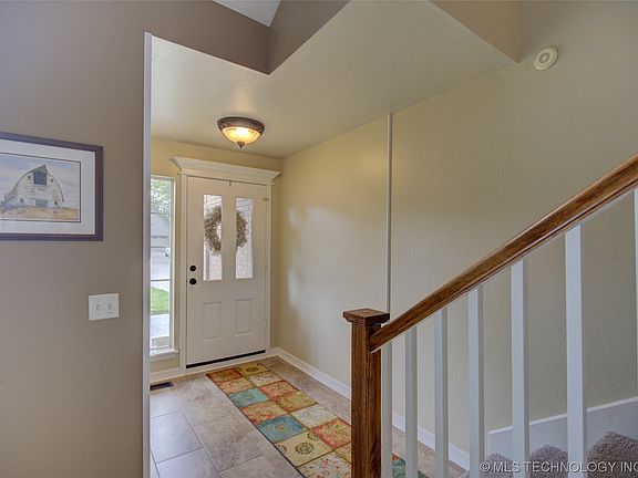 Great family home located in a cul-de-sac and well priced for Darlington South. Convenient to Hunter Park, walking trails, shopping, expressway and Jenks schools. Recent updates include, Samsung drop in oven/gas range, granite in kitchen and baths, master bedroom has double closets, vaulted ceiling & balcony, replaced master shower, bathroom sinks, solid surface flooring downstairs, upstairs carpet, paint, deck, water heater, blinds and fencing. Downstairs dining room is flex room, could be office or toy room. Sink in utility room. Upstairs & downstairs smart thermostats. Annual contract with Creepy Crawlers for insect control. Washer, dryer and fridge remain, but not warranted.