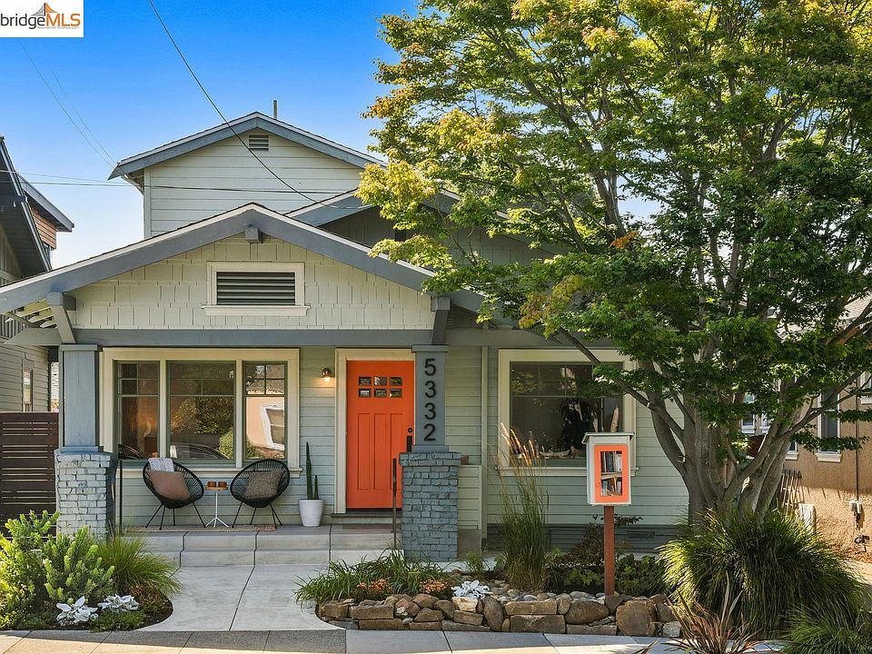 Your heart will skip a beat before you even cross the threshold of this feel-good Rockridge home -- hello, curb appeal! The front garden is home to a majestic Japanese maple, a cozy front porch, and the cutest Free Little Library. The lower level offers 2 bedrooms on the left side with a full bathroom in between, and living, dining, and kitchen spaces down the sunny right side. The living room features a tiled-in gas-fireplace with flanking bookshelves, and decorative wood floor inlay. The cheerful eat-in kitchen looks out over the rear garden and combines Heath Tile, Caesarstone countertops, and two-tone cabinetry. The back of the home has a skylit family room surrounded by garden views. The upper level offers a private primary suite with half bath, and a pretty home office. Rich Douglas Fir trim and flooring enrich the rear spaces, and 3 Minisplit AC units cool the sunniest rooms. The immaculate garden has it all: bluestone patio, apple tree, level lawn, ornamental plantings, and a detached Tuff Shed for storage. Chabot Elementary, Frog Park, Farmers Market. 2 blocks to Market Hall/BART/College Ave - Walkscore is 94!