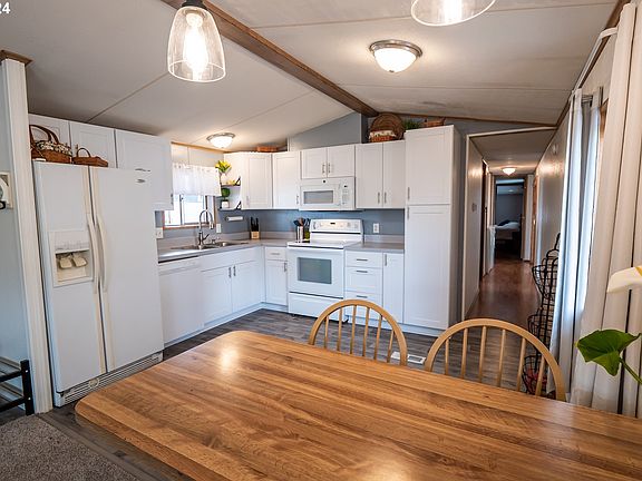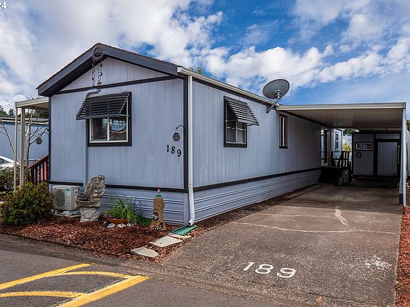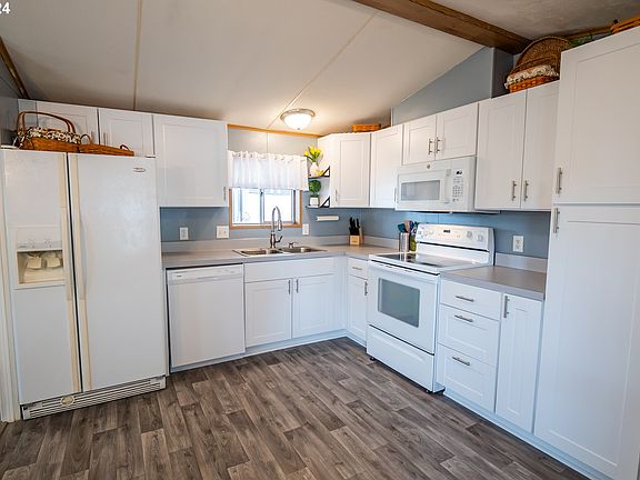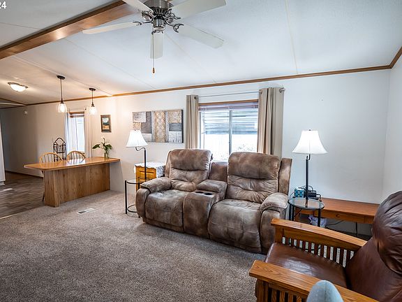 Don't miss this cozy spot in Santiago Estates! This 55+ park offers amenities including a club house with a seasonal pool, workout room, sauna, hot tub, ball court, putting green and horse shoes. Enjoy a true sense of community with the various events put on by your management team! This charming 2-bedroom, 1-bath manufactured home has a newly remodeled kitchen and bathroom with walk in shower (2023), vaulted ceilings in the living room, new linoleum flooring in the kitchen, new water heater, high-efficiency ductless heat pump in the front room and a brand new ductless heat pump in the primary bedroom, providing both heating and cooling for optimal climate control. Other recent updates include newer windows in most of the home, roof is less than 10 years old, workshop roof has been re-tarred within the last month and has new gutters. Outside, you'll find a gated porch, a private side yard, and fully fenced property perfect for enjoying our beautiful Oregon summer nights. The exterior amenities also include a 22x12 ft insulated shop equipped with 220v, offering ample space for hobbies or storage. The carport easily fits two cars and is covered so you never have to get rained on when arriving home. Park approval is required for buyers. Don't miss out on this home! Schedule a viewing today! Listing agent related to sellers.