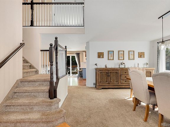 Pristine two-story home on a quiet, tree-lined street in Saddle Rock Ridge! This refreshing residence sits on a fantastic corner lot and showcases impressive curb appeal. The kitchen is well-equipped with recessed lighting, stainless steel appliances, and sleek quartz countertops. Enjoy bar-top seating in addition to the formal dining room. The living room boasts soaring double-height ceilings and an abundance of natural light. Upstairs, double doors welcome you into the light and bright primary suite which includes high ceilings, a large walk-in closet, and a luxurious five-piece ensuite bathroom. The second level additionally houses 3 light and bright bedrooms and a full bathroom. Discover more square footage in the finished basement! This prime area is complete with a large recreation area and a bonus room that would be perfect as a home office, playroom, or secondary family room. An outdoor oasis awaits you in the fully-fenced backyard which features a spacious deck and manicured lawn to play fetch with Fido! Located a short distance from Southlands, E-470, and in a desirable school district, this home truly has everything! Updates since 2019 include a brand new HVAC system with a humidifier and air purifier, new kitchen countertops, new basement flooring, backyard landscaping, and more.
