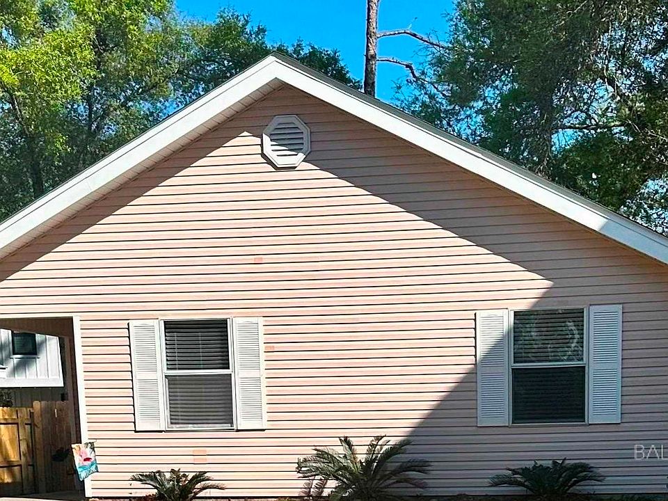 Bring the boat and immerse yourself in the breathtaking beauty of beach living in an adorable coastal cottage with a water view! With this home nestled at the end of Bay Drive in Orange Beach, you can have the tranquility of small town living with all the fun of the Gulf minutes away and Wolf Bay only steps away. Fresh paint and ceramic tile throughout the entire home makes it low maintenance. The primary bedroom has its' own bath and walk-in closet. Two guest rooms make it easy to invite company, have an office or give the kids their own space. The backyard has a new fence along with a free-standing storage building for beach gear, tools or bikes. Bring your golf cart, too, so you can enjoy the relaxed-pace of island life AND if you have a boat this neighborhood has no HOA but owners can opt into the local POA for only $195 annually to have access to the members-only boat launch, docks, beach and covered picnic areas. THERE ARE THREE WATERFRONT MEMBERS' ONLY AREAS FOR YOU TO USE AND ENJOY! This would make a great weekend retreat house or family haven where the kids can ride their bikes to school and fish all afternoon. Whether you're exploring the vibrant local scene or simply relaxing on pristine beaches, this property offers the perfect blend of quiet convenience and seaside charm. This home was built in 1996 and has never flooded!!! Easy to show so don't hesitate to check it out! Sellers are MOTIVATED!