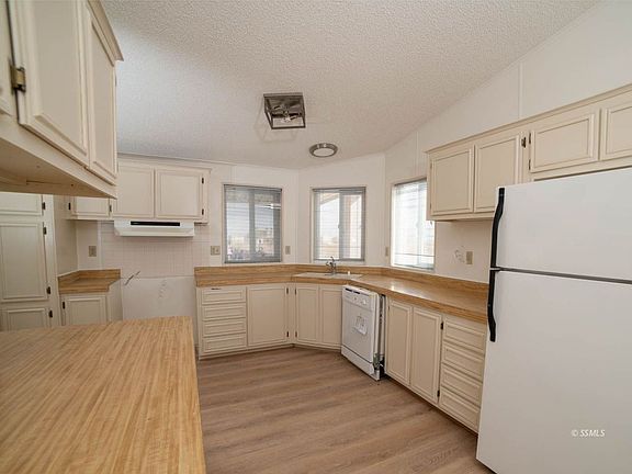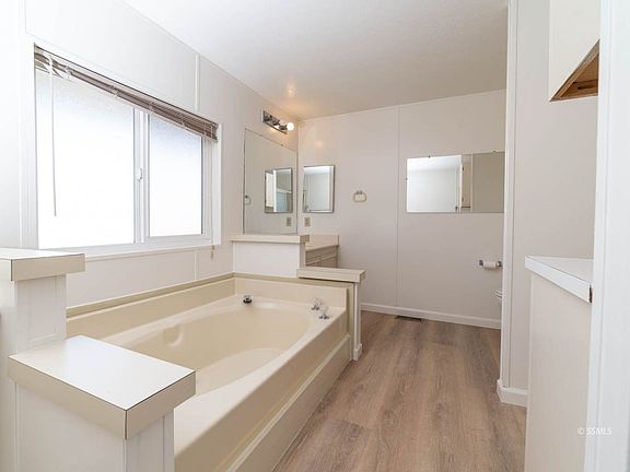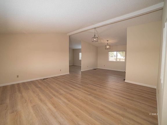 This manufactured home sits in a wonderful setting with great views. The property is fenced and cross-fenced with a large area fenced with rabbit fencing for a garden area! Property is landcaped with front and back porches a large two car garage. Fruit trees too! This three bedroom home has had windows replaced and has new vinyl plank flooring and new paint.