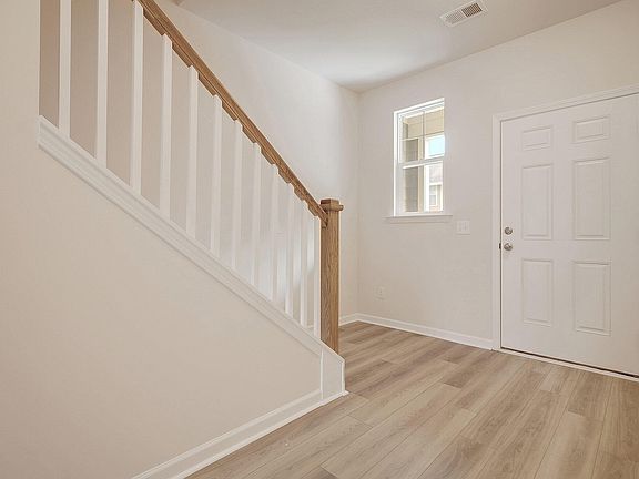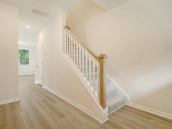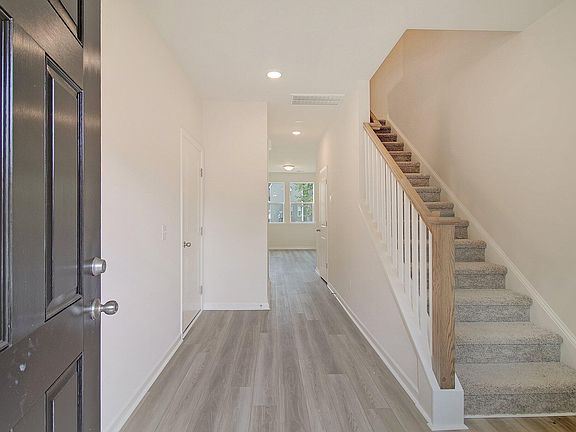 Welcome into a gracious foyer with wide plank LVP flooring and 9 foot ceilings in this striking townhome with Hardiplank exterior & open main living. Step back to find your inviting chef's kitchen perfect for entertaining or cozy nights in- quartz counter tops & stainless appliances. Plenty of storage awaits in the 42'' whisper gray upper cabinets. Combined living & dining flows to back patio overlooking lawn. Convenient powder room nestled beneath stairs. Upstairs relax in your generous primary suite w/ luxe spa style standing shower, double vanities and sizeable walk-in closet. Laundry is smartly located in upper hall. 2 additional bedrooms offer great spaces in the front as well as a generous full bath with tub. Single car attached garage. Back patio opens to green HOA space.