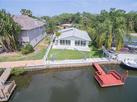 BEAUTIFUL WATERFRONT HOME! Tastefully remodeled one story home just a short boat ride to the Gulf of Mexico and the Pithlachascotee River. Ride your golf cart to nearby shopping and dining. Completely updated kitchen and baths with gorgeous granite counter-tops! The kitchen features new Samsung stainless steal appliances, granite counters with breakfast bar, glass tile back-splash, soft close drawers, adjustable shelving, pull-out pantry drawers & recessed lighting. Fresh paint and new flooring throughout. Enjoy the waterfront view from your huge air-conditioned Florida room. Park the boat along-side your floating dock or store on the davit.