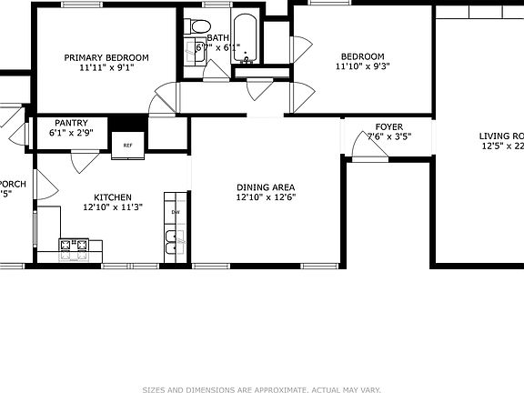 Two full size bedroomsTwo-car garageBackyard includes a patioAttached back porchSeparate dining roomOne bathroomHardwood floors