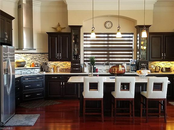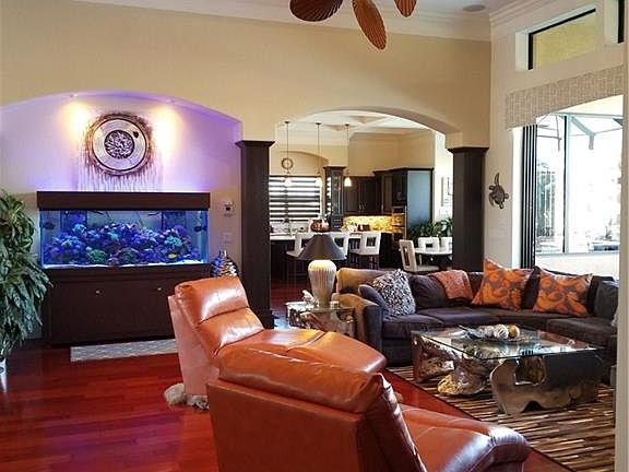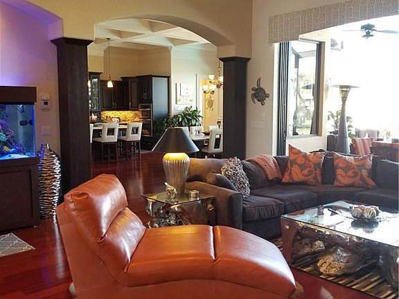 Gorgeous custom built home. 16" ceilings, spacious open floor plan, bright living area features hardwood floors with black porcelain throughout; waffle ceilings with crown molding in kitchen and dining room, large 10ft doors throughout. Beautiful lanai, built-in kitchen with professional gas and charcoal BBQ, outdoor burner, dishwasher and beverage fridge. Heated salt water pool and spa with vanishing edge. gourmet kitchen with all hardwood cabinets and marble counter tops. Luxurious master bedroom and bathroom with center Jacuzzi, walk around shower and dedicated A/C system. Pre-wired sound system with multiple zones as well as alarm system which can be monitored remotely. PGT Impact resistant windows and doors. Locates in Yacht Club area with sail boat no-bridge gulf access. Custom Mahogany entry front door. A/c in garage with insulated doors. Spectacular home!!
