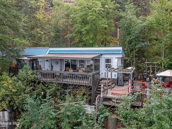Spokane River, River View Island Estates Area, 133' frontage, 2 bdrm, 1 bath , 700 sq ft. Cabin is mobile home per assessor, Inviting side patio with loads of privacy. Parking on upper road as well as driveway down to side of cabin. Boat dock included.