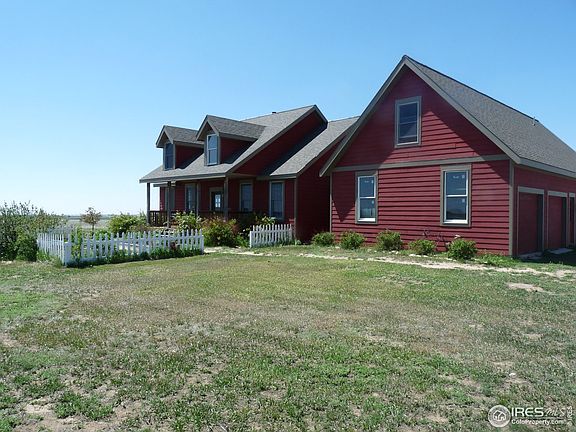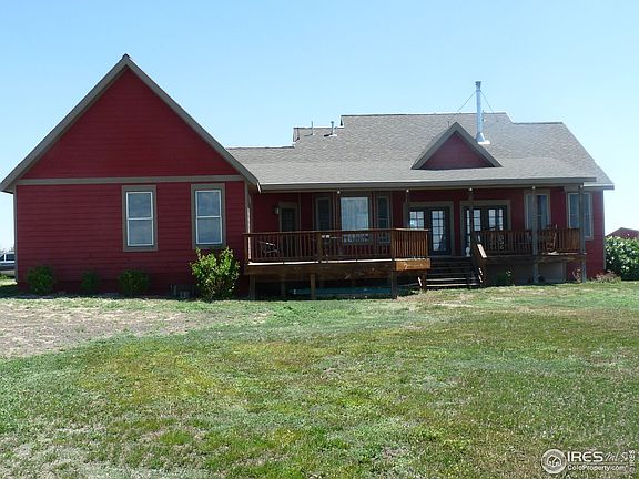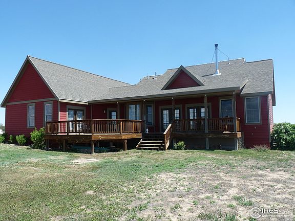 MASSIVE $64,000 PRICE REDUCTION! Traditional Farmhouse-style home with spectacular front range views. Ideal Homesteading situation. On 80+/- ac. eligible to be split through Weld County RE process. Incredibly peaceful and quiet. Custom built home features 4 bedrooms (1 non-conforming just needs closet), 4 slate, or tile-finished baths, solid cherry kitchen, turn-of-the-century trim details, solid oak 4-panel doors with traditional crystal knobs. Warm and welcoming colors feel like home. Covered front and back porches catch breezes, windows offer huge vistas. 2X6 outer wall construction, in-floor heat, wood stove, HardiPlank siding, hundreds of trees as windbreaks. Numerous water and elec. lines to code, stubbed to several locations for future use. Set up for additional off-grid power potential. Existing wind turbine needs maintenance. Land is ready to pasture or plow. Several smaller buildings available for chickens, rabbits or small livestock.