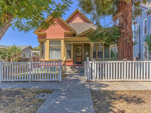 Hollister Victorian Vintage charm exudes exquisite embellishments of its time while seamlessly incorporating modern touches. From the inviting covered front porch, to door knobs, 12 foot ceilings, crown molding, and large windows, splashes of character are evident throughout even with the entire home being freshened & updated including contemporary Pergo flooring, electric and plumbing. Two bonus rooms allow for additional space and functionality of this impressive home. Be amazed by the plethora of fruit trees and almost 300 s.f. of raised vegetable garden beds. Oversized attic with high ceiling possible to convert to a second story. Walking distance to park, playground, library, restaurants and major annual downtown street events. The home is featured in the Hollister Historical Society walking tour. List of upgrades in last photo.