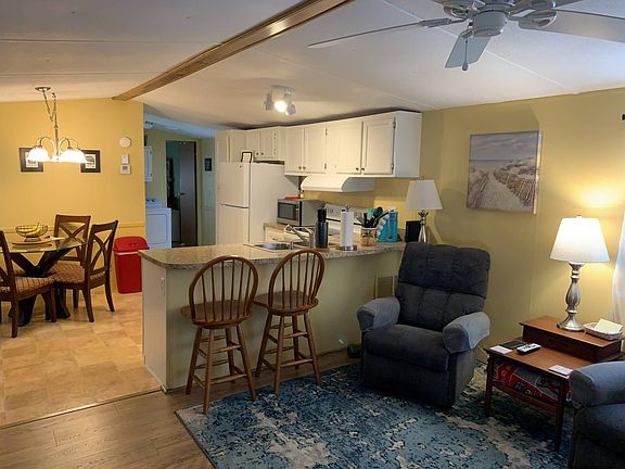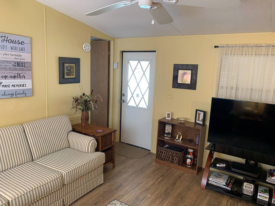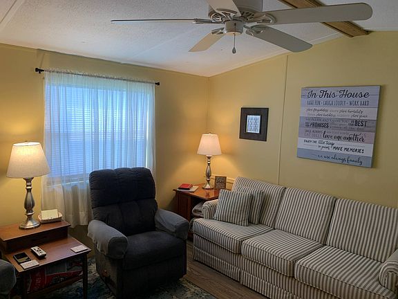 Wow! This 55+ home will knock your socks off. You now have a great opportunity to own this 2 bedroom 1 and 1 half bathroom mobile home on the Golf Course in Hidden Golf. The guest bath was updated and laminate flooring was installed in several areas. Ceiling lights in the dining area, kitchen, Hall, and both bathrooms were all installed in 2018. The present owners added more new features in 2020 to include A New Refrigerator, stove and vent hood, washer and dryer. Most importantly a new Rheem Air Conditioner with 2 heat strips was installed in 2020 and has a 10 year warranty. The owners extended the carport also in 2020. A New Roof, Golf Ball Net, and lighted ceiling fans were are installed in January of 2023. The Lanai has central heat and air adding to the original square foot. This community boasts of two clubhouses, two swimming pools, and two hot tubs. There is a restaurant on the premises. Currently, there is live music being played on weekends by the lake. The community has spectacular views of the sunrise over Lake Henry and you can even view a rocket launch from this area. This is a great place to come, sit, relax, and enjoy the outdoors all while enjoying listing to wonderful music. The two Clubhouses in the community feature Pool Rooms, Library's, and workout equipment. Other available sports to participate in in this community include Tennis, Pickleball, horseshoes, cornhole, bingo, and cards. This home and community is a must see to believe.