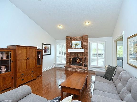 Spacious Bungalow with In-Law Suite Potential! Pride of ownership shines in this custom-built, open-concept bungalow offering approximately 1,800 sq. ft. on the main level. Nestled in a quiet, family-friendly neighborhood and backing onto greenspace, this home combines thoughtful design with comfort and functionality. The main floor features a bright and airy living room with a cozy wood-burning fireplace, a formal dining room, and a large kitchen complete with granite countertops, subway tiles, ample cabinet space, and elegant porcelain flooring. A sunroom off the kitchen floods the space with natural light and leads to a deck overlooking the private, fully fenced backyard. Gleaming hardwood floors, California shutters, and tasteful finishes run throughout the main level. The spacious primary bedroom includes two closets and an ensuite with a standalone soaker tub and a separate shower. Two additional bedrooms, a 4-piece bathroom, and a convenient laundry/mudroom with access to the double garage complete the main level. The fully finished basement offers excellent in-law suite potential, with plumbing and electrical in place for a second kitchen. It boasts a large games room with a bar, a cozy family room with gas fireplace with custom mantle and surround, four additional bedrooms, a renovated bathroom, and a walkout to a covered lower deck—perfect for multi-generational living or entertaining. Located close to major highways, shopping, schools, and just minutes from two universities, this home offers the perfect blend of space, style, and location. Provincially protected land at rear assures privacy and tranquil setting.