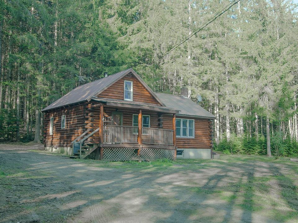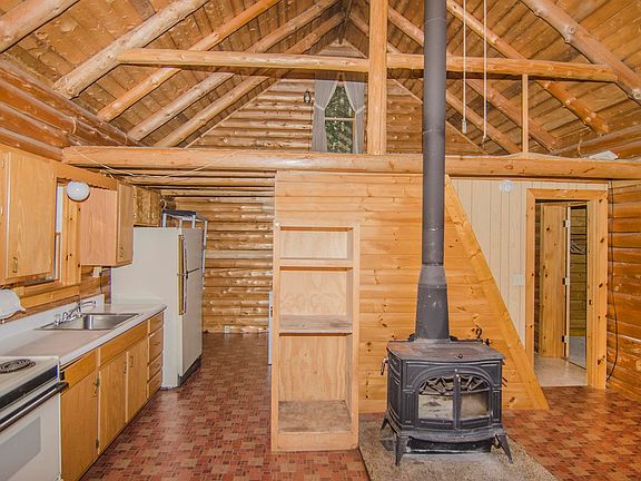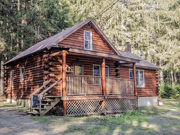 Delightful log home on almost 50 wooded acres almost at the end of a class 4 dead end road. Eat in kitchen with cathedral ceiling. Large covered porch. Full poured concrete basement. 1 bedroom on the first floor but sleeping loft. Town says it is 1 bedroom. Road is better suited for 4 wheel drive vehicles.