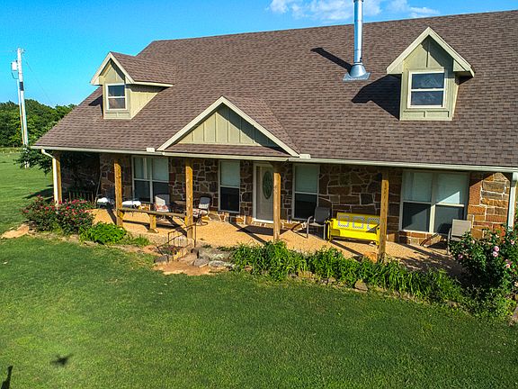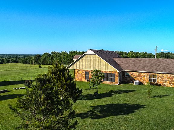 WOW! YOU WILL ENTER THIS GORGEOUS FENCED AND CROSS FENCED 52.5 ACRES THROUGH A BEAUTIFUL WROUGHT IRON GATED ENTRANCE. W/ACCESS TO THE CANADIAN RIVER THAT WILL TAKE YOU INTO LAKE EUFALLA, THIS PROPERTY HAS SO MUCH TO OFFER. SOME OF THE OTHER GREAT FEATURES ARE: 3 BEDROOM ROCK HOME W/3 FULL BATH, W/ROOM TO ADD A CLOSET IN THE 3rd BEDROOM, A COVERED COWBOY PORCH W/TREATED OAK, COVERED PATIO, KITCHEN W/GRANITE COUNTERS, ALL THE APPLIANCES ARE FAIRLY NEW & WILL STAY, A PANTRY, AND A LARGE ISLAND W/WINE RACK IN IT, VAULTED WOOD CEILING IN THE LIVING ROOM W/LOPI WOOD BURNING STOVE IN FRONT OF A ROCK WALL, CROWN MOULDING THROUGHOUT THE HOME, SOLID WOOD DOORS, WINDOW FRAMES, AND BUILT-INS. THERE ARE VIEWS OF THIS GORGEOUS ACREAGE FROM EVERY ROOM IN THE HOME. AN APPROXIMATELY 60X60 METAL BARN WITH A TACK ROOM, ONE STALL AND ROOM FOR SEVERAL MORE. A 12X16 OUT BUILDING, 30X40 NEWER METAL SHOP, AN ENCLOSED CHICKEN PEN, A GORGEOUS 65 FOOT CANYON FILLED WITH LARGE ROCKS, THREE PONDS, AND MUCH MORE!!