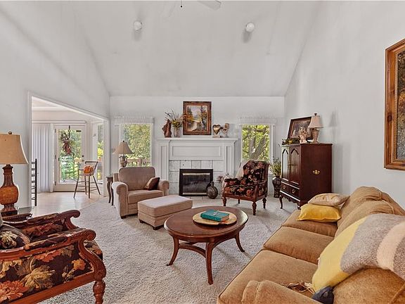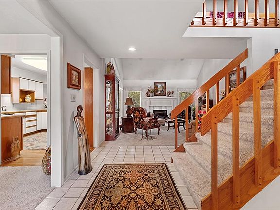This stunning 4-bedroom, 3.5-bath home is situated on nearly an acre of land. Mature trees surround the property and feature a serene creek, creating a picturesque setting. The property features a new roof, ensuring peace of mind for years to come. The main floor is designed for convenience and comfort, featuring the primary bedroom and bath, along with the laundry, all easily accessible. The spacious master bedroom offers abundant natural light and some of the best views in the house. The living area is highlighted by soaring vaulted ceilings, adding to the home's airy feel. Upstairs, the loft area provides a cozy spot for a reading nook or a perfect office space. Outdoor enthusiasts will love the two-level deck, ideal for entertaining or simply enjoying the view. The finished basement offers a large living area with a dry bar and walkout access to the lower deck, extending your living space into the beautiful outdoors. A third garage located around the back of the house provides a perfect spot for garden supplies or a workshop. This home is a true gem, offering the perfect balance of indoor comfort and outdoor serenity.