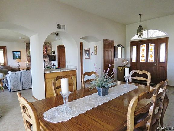 Six Car Garage ~ In Ground Pool ~ Killer Views ~ 2.40 Acres. This 4,103 sf Hacienda sits high up in the foothills on the west side of Kingman AZ. Custom built in 1983, the main house has 5 bedrooms and 3.5 bathrooms. The north wing has three good sized bedrooms and a hall bathroom with dual sinks, cast iron tub shower combo and tile surround. The main bedroom is 19.9 X 14 with double doors out to the back patio, walk in tile shower, separate toilet room, long vanity with dual sinks, two walk in closets and a deep soaking tub that's framed by a wall of glass to the atrium. Common areas consist of a formal sunken living room, formal dining area, family room with brick gas fireplace, half bath and large laundry room. Kitchen has an eating nook with a pantry wall, island, electric range (plumbed for gas) and fantastic views of the City and Hualapai Mountains from the window over the sink. Large great room has a built-in bar with sink and mini fridge, adjacent sunken bonus room and the pool table stays. South wing has a nice sized bedroom, attached bathroom with custom tile counter tops, red tile walk in shower and also opens to the hall if you want to share. Attached guest quarters has its own entry and patio, one room as living/bedroom, kitchenette, walk in closest and bath with walk in shower. Home has solid wood interior doors, ceiling fans, sky lights, three heating and air units, two gas water heaters, natural gas, city water and two septic tanks. Large covered rear patio, garden shed, grass yard and an inground fiberglass pool with a slide and tall walls for wind break and privacy. Three car attached garage and a 38 by 30 deep detached garage with half bath, storage closet, evap cooler, small wall furnace, sky lights, ceiling fans, auto openers and two 220 outlets. 534 Lomas Flojas St. Kingman, AZ $675,000.00.