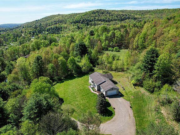 Discover this Upstate New York gem, privately nestled on a scenic 38-acre parcel with distant hillside views and endless opportunities for outdoor recreation. Ideally located just south of Ithaca and north of Binghamton, the property offers convenient access to amenities while providing a peaceful retreat surrounded by natural beauty. Lovingly maintained inside and out, the home features rich natural wood finishes, exposed beams, tongue-and-groove ceilings and walls, hardwood floors, an open floor plan, and soaring cathedral ceilings that create a warm and inviting atmosphere—perfect for entertaining or quiet reflection. The main level offers a spacious primary suite with private bath, wrapped in warm wood tones, along with a second bedroom on the opposite side for added privacy. Adjacent to the dining area is a bright and airy den with vaulted ceilings, walls of windows, and direct access to the rear deck—ideal for a guest room, home office, or relaxing sitting area. High-speed cable internet is available to support remote work or streaming needs. The open kitchen is equipped with oak cabinetry, updated appliances, and a large center island with breakfast bar. Need more room? The finished lower level features a generous family or recreation room, a guest room with full-size windows, a newer full bath, and excellent storage, plus walk-out access to the outdoors. In total, the home offers three full bathrooms and a two-car attached garage, with ample additional parking for guests. Outside, enjoy a beautifully landscaped lawn, concrete walkway leading to a quaint covered front porch, a long private driveway, and a serene forest pond set in a natural wooded area. With acres of woods for hiking, hunting, four-wheeling, camping, or peaceful exploration, this is a rare opportunity to own a private retreat between the Finger Lakes and the Southern Tier—offering the perfect balance of seclusion and accessibility to major East Coast destinations.