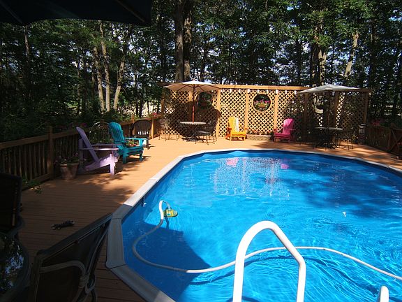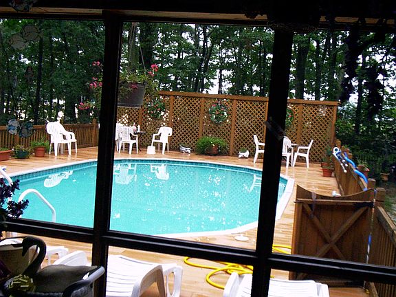 Back on the market! This charming log home was leased for a year and is now available for sale again. Why go away for vacation when you can stay home and enjoy the comforts of your very own log cabin get away. This one of a kind home is nestled in the woods on a generous 1 acre lot. The home features a beautiful custom kitchen with a built in baking center. Several real stained glass windows are in rooms throughout the home. The wrap around porch leads to the back deck where you can enjoy the pool and gaze at the large Koi pond adjacent to it. The basement is finished and is decorated with a 50's diner theme. The house may not be the biggest draw with this property. The large 3 car garage is perfect if you to set up a shop or if your car is your prized possession and you want to keep it out of the elements. Are you a contractor? Set up your shop here and work from home. The garage has a second floor which can be used for office space or storage. Lovely home and a premium garage / shop - Who says you can't have it all.