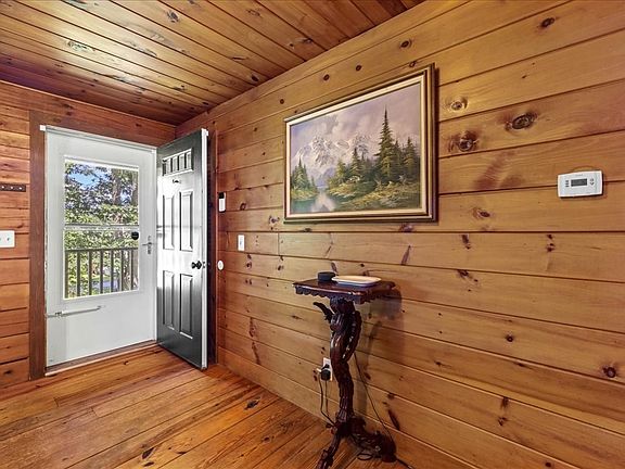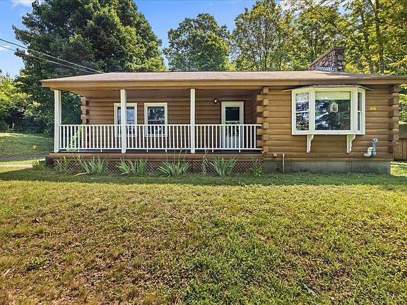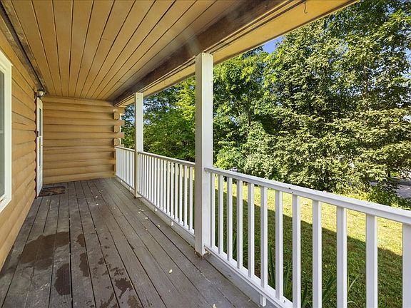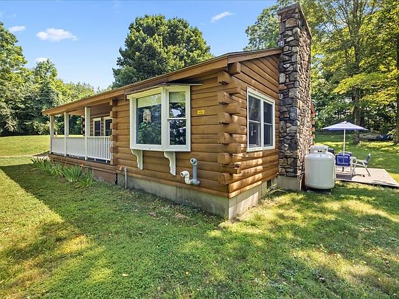 OFFER DEADLINE MONDAY 08/14 AT 12 P.M. Nestled in a serene, wooded setting, this charming log cabin is a wonderful rustic retreat. With its open floor plan, beamed ceilings and stone fireplace, this home is sure to captivate your heart. The open floor plan seamlessly connects the living area, kitchen and dining space, creating an inviting ambience for both relaxation and entertainment. Two cozy bedrooms and a full bathroom complete the main level. Downstairs you will find a partially finished basement which conveniently adds space for an office, den area and bonus room. Outside in the spacious private yard you will find a wood deck, firepit and storage shed. Many major system upgrades have been made including a replaced septic system (2016), replaced well tank (2017), new propane furnace (2022), new water heater (2022) and a new whole home water softening system (2022). Move in and enjoy the warm natural beauty of this home.