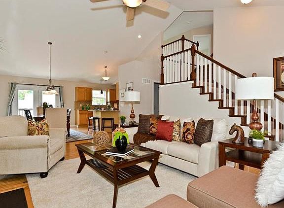 Fenton, Fox Schools; Charming 1.5 Story Home with Four Bedrooms, 3.5 baths and more than 2500 sf of finished Living Space; Vaulted Ceilings and Hardwood Floors; Gas Fireplace in the Great Room; Updated kitchen with Granite Counters, Maple Cabinetry, Tile Backsplash and Breakfast Bar; Large pantry in Breakfast Room; Main Floor Master Suite offers TWO walk-in closets, a bay window and spacious bath with whirlpool tub & separate shower; Upper level features great bonus/loft space with hardwood floor; Two spacious bedrooms, both with walk-in closets, share a jack-n-jill bath; Finished walk-out Lower Level features rec room with built-in shelving for media storage, fourth bedroom with walk-in closet, a full bath and office space with built-in shelving that would also work as play room or craft/hobby room; Spacious yard offers deck with partial pergola and large patio; Architectural roof, 2014; Washer, Dryer & Fridge to Remain; Shopping, Restaurants & Entertainment are Five Minutes Away