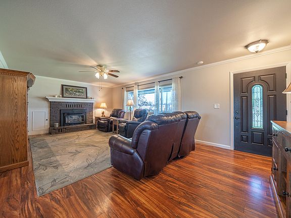 Beautiful 3Bed, 2.5Bath 5 Acre ranchette. The home boasts many amenities to include, custom cabinets, quartz counters, stainless steel appliances and insulated floors. Master suite with large garden tub and walk in closet. Mini-splits in all 3 bedrooms with anatural gas fireplace and wall heater. The landscape is A.C.I.D irrigated, with year around pond, fenced and cross-fenced for rotational grazing and pasture management. An outside entertainer's delight with a spacious covered back patio. lighted firepit area, separate uncovered sitting area with a nearby water feature. The perfect place to sit and enjoy the sunrise and sunset. Automatic sprinklers, with orange, lime, lemon, peach fig, cherry and apple trees. Large shop with 4 roll up doors, concrete floors reinforced with rebar.