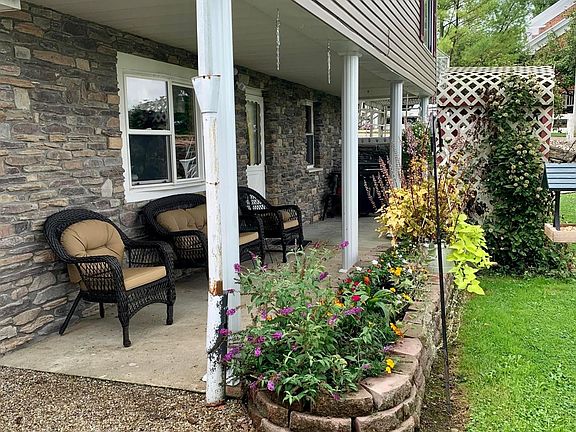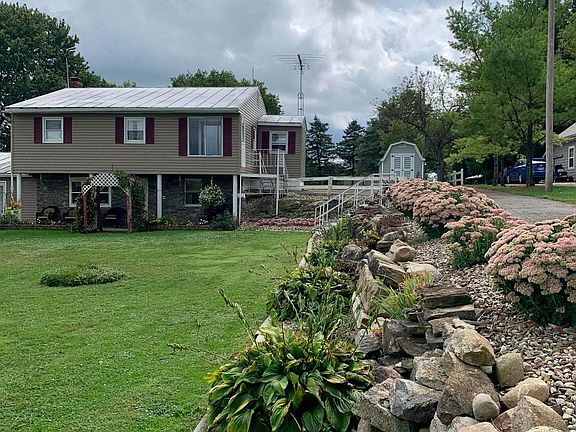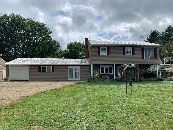 Amazing setting for the outdoor enthusiast! Property offers mature trees that provide great shade, orchard, garden area, shooting/target range, outdoor fire pit, chicken coop, carport & storage shed. 2 car detached garage w/ new 100 amp service offers water, electric, concrete & drain . Dual driveway entrances! Beautiful landscaping! Many updates including newer siding, shutters, stone front, new pillars, & updated windows. New C/A in 2019. Lower level offers updated kitchen w/ oak cabinets, dining room & pantry, family room, updated bath, den/office area, & mud/sun room that walks out to patio area w/ fenced in area for pets! Also a Root Cellar! Upstairs offers additional living room, 3 BR, Full bath, enclosed walk-out porch to rear. One car attached garage. Beautiful country setting