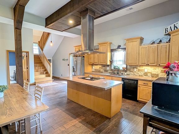 Spacious Gambrel roof Colonial style home with 13' raised ceilings on the main floor creates an expansive and open feel for family gatherings. The open concept great room and kitchen are the perfect entertaining area. Kitchen features beautiful concrete countertops, gorgeous copper sink, and cabinet and counterspace galore. Range/oven, refrigerator, washer and dryer all stay. The upstairs boasts a large open loft type area for game room or family room with an extra side space area that could be study area, 4 bedrooms and 3 full baths. The garage is a dream, 4 car and plenty of storage space. The 1.25 acres is a secluded setting with trees, and fenced back yard. Partial privacy fence. Playset stays. 12x14 mini barn with a carport on one side for boat or outdoor toys. Roof is 2 years old complete with tearoff, 1 layer. HVAC 1 year old. Iron filter 1 year old. 400 amp service to home.