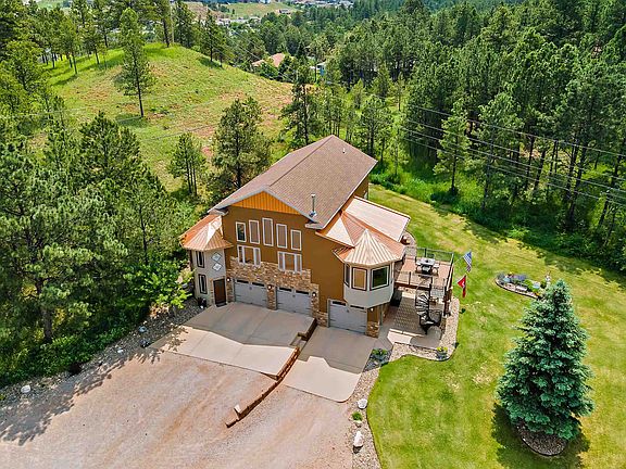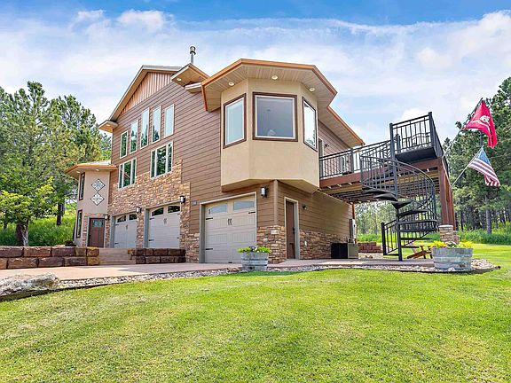 Listed by Cody Brown, Engel & Voelkers Black Hills, 402-910-3553. Discover this stunning residence boasting a great room floor plan with 17 ft ceilings in the living room, hardwood floors, and a captivating 3-sided fireplace with floor-to-ceiling stone. The kitchen features maple cabinets, stainless steel appliances and a pantry. The master en suite offers his & her walk-in closets, a custom shower, Jacuzzi tub, and a private deck with a salt water hot tub. With 3 bedrooms, a full bath, and a bonus room upstairs, there is an abundance of space to comfortably accommodate your household. The lower level includes a private guest area, wine cellar, sitting room, and a mud room with access to the heated 3-car garage. Outside, enjoy a sprinkler system, 2 RV pads, one of which includes an electric & dump station, a built-in concrete basketball half-court, and a large, heated shop with a full bath and 10 ft garage door. Did we mention all the beautiful landscaping on this 1.71-acre lot?!