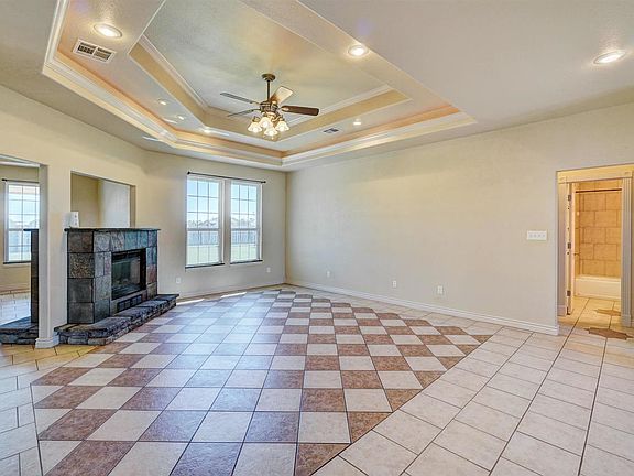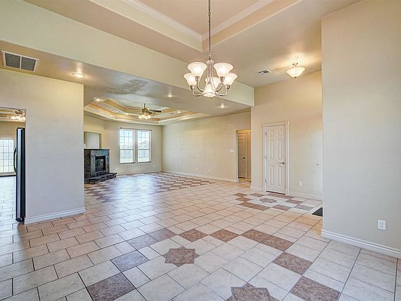 Beautiful home, well kept, like new condition. Large open formal living & formal dining with triple designer high ceilings, dual fireplace to breakfast nook & den. Awesome kitchen, beautiful cabinets, breakfast bar, granite countertops, stainless steel appliances. Large secluded master bedroom, triple ceilings, luxury master bath with 6 foot whirlpool tub & separate tiled shower with seat, walk-in closet. Beautiful crown molding throughout. Walls of windows for natural light. Double french doors to covered patio. Storm cellar, wood fence on steel poles, garden area, side entry oversized 2 car garage & 1 car carport, storage shed with electric & to RV pad. All tiled floors throughout, carpets in bedrooms.