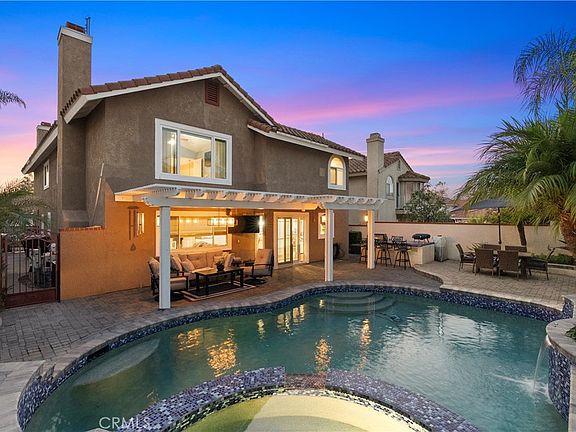 Welcome to this exquisite dream home located in the prestigious East Lake Village of Yorba Linda! This stunning 4-bedroom, 3-bathroom home, complete with a bonus room, offers 2,796 square feet of elegant living space on a 5,000 square foot lot. As you enter, the grandeur of high vaulted ceilings, the sweeping curved staircase, and travertine tile flooring greets you, setting the stage for the timeless class and modern comforts that make this property truly exceptional. The heart of the home is the well-appointed kitchen equipped with granite countertops, a stunning kitchen island with a convenient vegetable sink and bar seating, a paneled refrigerator, and high-end appliances, including a Thermador 6 burner gas stove and oven and a wine fridge. The kitchen flows seamlessly into both the family room and formal living and dining areas, creating an abundance of natural light, which provides an inviting and open atmosphere perfect for gatherings. The family room is a cozy retreat featuring a charming fireplace and custom built-in shelves, perfect for relaxing evenings with the family. Down the hall, there is a main floor bedroom and a full bathroom with a step-in shower, ideal for guests or multi-generational living. Upstairs, you will appreciate the rich hardwood flooring throughout the remaining bedrooms and bonus room. The primary suite is a spacious haven with a double door entry and walk-in closet. The ensuite bathroom offers a dual sink vanity with granite counters, a walk-in shower with a glass enclosure, travertine accents, and a waterfall shower head. The remaining bedrooms are generously sized and share a beautiful hallway bathroom, complete with a dual sink vanity and a shower-in-tub combination. The spacious bonus room is a versatile space that can be used as an entertainment room, a children’s playroom, a home gym, or an office, providing endless possibilities to suit your lifestyle needs. Step outside into your private backyard oasis surrounded by lush landscaping and palm trees. The sparkling pool and spa offer a tranquil retreat, while the built-in BBQ and bar area add a great touch for outdoor dining and entertaining. The space under the Alumawood patio is perfect for year-round enjoyment. East Lake Village offers an unparalleled lifestyle with amenities that include: 15-acre lake, 4 pools, adult pool, clubhouse, newly renovated gym & spa, pickleball and tennis courts, several family-friendly events throughout the year, and so much more!