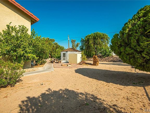 Golden Shores Getaway! This will make a fantastic vacation home to come to with numerous friends and family members. There is plenty of space to park all of your toys from, boats, p.w.c.'s, side by sides, motorcycles, etc. on this just over half an acre lot. The front of the house features a nice patio and balcony off of the master suite, so you can enjoy the views of the desert and the mountains that surround Topock Gorge. As you enter the home you will find a large living room with plenty of windows to enjoy that view. As you walk up a few steps you have the family room complete with gas fireplace with a stone surround for those cold nights. The family room also has two doors to go onto the expansive backyard balcony! The kitchen features an eating bar, plenty of storage and counter space, and a double wall oven. beyond the kitchen is the formal dining room big enough for the biggest of groups. as you go downstairs you will enter the roomy 3-car garage, from there just enter the door to the right and you will enter the home bar and game room. This room is the perfect place to get together after a long day on the river or riding in the desert. The room features a 3/4 bath, kitchen, huge bar with seating for a small army. beyond the bar is a separate game room with room for a pool table, card table, and shuffleboard. As you go into the backyard you will see the outdoor kitchen area underneath the covered patio and a screened in, jacuzzi to fit 8 people in.