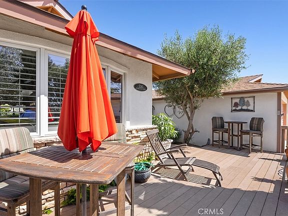 This is the one! A gorgeous beach home, which has been upgraded, expanded and customized throughout. It all starts with amazing curb appeal. As you pull up you will see the driveway has been coated, there is a nicely landscaped & drought resistant front yard + a custom front deck with several sitting areas, leading to an elegant Dutch door with pocket screen at the entry. Once inside, there is a tiled step up entry leading to the absolutely stunning kitchen which has been extensively remodeled & expanded. The kitchen features an open concept, with a large center island, custom cabinetry with accent lighting, a pantry + wine rack, granite countertops, stainless steel appliances, including a chef's style oven & range with vent hood, dishwasher, built-in microwave, wine cooler & refrigerator, which remains with the home + a large dual skylight, directly over the island. There is also a nice sized dining area adjacent to the kitchen. Next comes the spacious living room addition, which features extensive built-in shelving + a gas burning fireplace with a really nice hearth. There is a separate inside laundry room, followed by a guest bathroom with an updated vanity with granite counter, marble tiled floor + a skylight. The front bedroom is nice sized, and there are two primary bedrooms as well. The front primary is standard sized and offers a remodeled bathroom, including an expanded tiled shower with glass enclosure, vanity with granite counter + a skylight. The rear primary suite is a fully permitted addition to the home and features 2 separate mirrored wardrobe closets with built-in organizers + a French door leading to the rear deck. There is also a fabulous primary bathroom addition offering a walk-in tiled shower with glass enclosure, separate stand alone bathtub, vanity with granite counter, tiled floor + a skylight. Bonus features include: hardwood flooring thru-out, recessed lighting, crown moldings, Anderson dual pane windows, plantation shutters, copper plumbing, tankless water heater, updated heating & A/C + a 30 year roof installed in 2011. Let's not forget about the private rear yard with a large seating deck, built-in BBQ with stacked stone facade & stainless steel grill with natural gas connection, outdoor fireplace, artificial turf, nice landscaping, evening lighting + a storage shed. This lovely home is walking distance to award winning schools, a park, golf, shopping, restaurants, and is only a 5 minute drive to the beach, truly a must see!