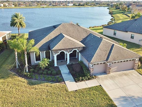 THIS BEAUTIFUL, WATERFRONT, BUILDER'S MODEL HOME IN HARBOUR ISLES is ready for its second owners just steps away from the resort-style recreation center that attracts so much attention to this exclusive neighborhood! Pools, trails, fishing, a clubhouse with fitness center, playground, sports courts, lakefront gazebos, and even RV/boat storage are available in this community so close to new shops, restaurants, and easy routes to Tampa, Sarasota or Gulf beaches! It's all made better, of course, in this 2,922-SF home with extended, screened and roof-sheltered lanai overlooking the central lake from a landscaped yard of more than a quarter acre. The Suarez Windsor model offers 4 bedrooms and 3 baths, including a 700-SF lakeview master suite, plus a lakeview bonus room connected to a bed/bath combo in the opposite back corner -- so it creates another potential suite for guests or in-laws but also works on its own as an office, den, game room or almost anything you might imagine. Formal living and dining rooms in front flank a decoratively tiled foyer, and at the heart of the home is a sprawling family room and kitchen with breakfast area leading through triple sliders to that waterfront lanai for fantastic entertaining. Tile, granite, stainless steel, plenty of raised-panel wood cabinets with crown, and even the builder's model window treatments complete the pretty picture. The 3-car garage adds air-conditioned extra storage space, and now all this home needs is you as the next owners!
