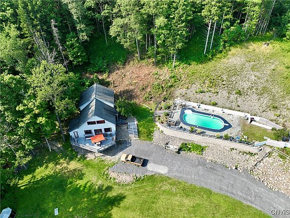 Welcome to your private sanctuary, a stunning 10-acre A-frame home that offers a perfect blend of tranquility and modern living, all while being just a stone's throw away from the picturesque Skaneateles Lake. This charming retreat features 3 spacious bedrooms and 2 full bathrooms, along with a convenient 1st floor laundry area. Enjoy the versatility of an additional room off the dining area, ideal for a home office or workout space. Step outside onto a beautiful deck that showcases breathtaking panoramic views of the serene landscape, perfect for entertaining. Dive into relaxation with an inviting in-ground pool, gather around the cozy fire pit, or unwind in the indoor hot tub area, complete with a brand-new wood stove for chilly nights. This unique property also includes a chicken & duck coop, a fantastic opportunity for hobby farming, along with an outbuilding that can serve as a workshop or extra storage space. Whether looking for an entertainer's dream, a potential investment property/Airbnb, or a forever home, this A-frame gem has it all. Enjoy the serenity and beauty of your surroundings while enjoying the comforts of living in this peaceful retreat. Lot is being subdivided.