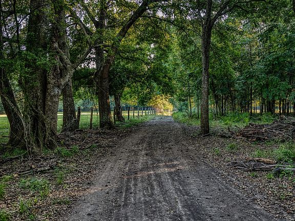 The land is fully fenced and cross-fenced with rolling pastures, mature pecan trees, and multiple ponds (including one with a fishing pier). Wickson Creek forms much of the back boundary. Wildlife is abundant, and the setting is private, with the home tucked behind a gated entrance and screened by mature trees.