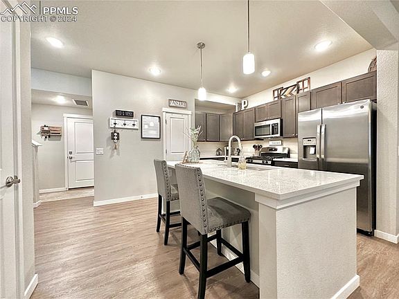 This impeccable and gorgeously-appointed open/great room concept 3-bed 3-bath END UNIT TOWNHOME LIVING IS IT! Super-clean double-car garage. Quartz counter tops and recessed large-bowl island sink are right across from level-bar seating; perfect for entertaining. Adjacent dining room is open and expansive. Stainless appliances all stay including refrigerator. LVP flooring on the main level is durable and easy to clean. Cozy living room w/gas fireplace is perfect for cold winter evenings. Washer/dryer are included! This townhome is turnkey and minutes from Costco, Target and dozens of other shops and restaurants up/down the Powers corridor. Local parks are outstanding. Don't miss this fabulous deal; schedule an appointment immediately.