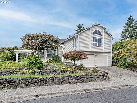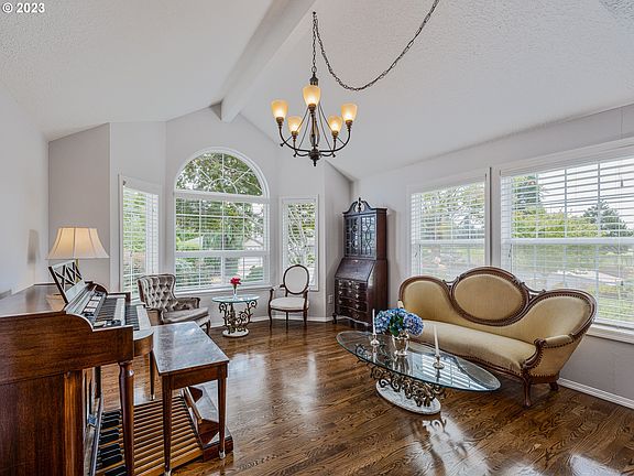 Beautiful, east-facing family home in the highly sought-after Rock Creek Neighborhood. Nestled on a tranquil cul-de-sac, this hidden gem features stunning view of the 8th hole at the prestigious Rock Creek Country Club Golf Course.You will love the main living area with hardwood floors, soaring vaulted ceilings with abundance of natural light and cozy woodstove with whitewashed brick. The expansive kitchen, features quartz counters, eating area and ample custom storage space. Enjoy holiday dinners in your traditionally appointed separate dining room. Retreat to the spacious primary bedroom, with vaulted ceilings, oversized windows, and walk-in closet. An additional alcove space, ideal for a quaint reading nook or a dedicated workspace, completes this haven. The attached primary bathroom offers walk-in shower and built-in shelving.Step outside into a backyard oasis with two covered patios, meticulously landscaped yard featuring roses, blueberries, a majestic fig tree, tulips, lilies, daffodils, daisies, lily of the valley, dogwood, and maples.Convenient to excellent schools, highways, PCC Rock Creek, Nike, Intel & more! This extraordinary home invites you to create cherished memories amidst the idyllic Rock Creek Neighborhood.