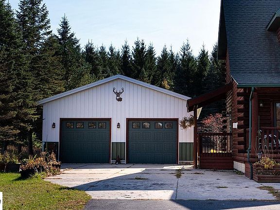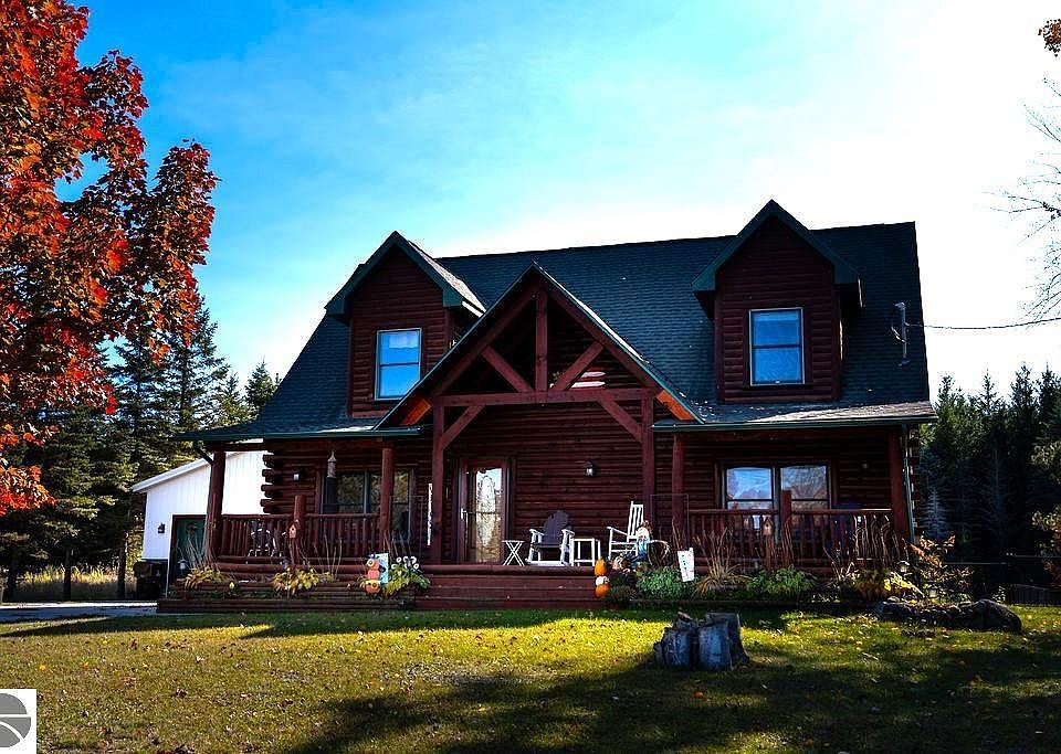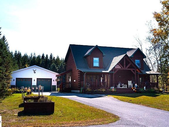 Have you ever stepped into a home and instantly felt like you're on vacation? This picturesque log home is surrounded by gorgeous evergreens and truly feels like you've been transported to a peaceful getaway in the mountains. Privately situated on 3.81 acres, this home features three spacious bedrooms, two full baths and an unfinished basement with egress, perfect for adding another bedroom and additional living space. The heart of this home is the stunning stone fireplace, perfect for cozy nights in. On the second floor you will find a large primary suite with a private bath and walk in closet and an open loft area that makes an excellent office space, playroom or additional family room. The large covered front porch is perfect for enjoying this perfect Fall weather and listening to the leaves fall. The 28 x 40 pole barn has plenty of space to house multiple cars, toys and have a workshop. Additionally, there are multiple garden areas and a second home just for your chickens! This past year the seller has added a whole home generator, fenced in a large portion of the back yard, added new gutters and down spouts as well as a new storm door and washer. You must see this home in person to get a true feel and understanding of all it has to offer!