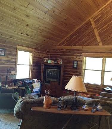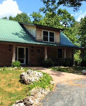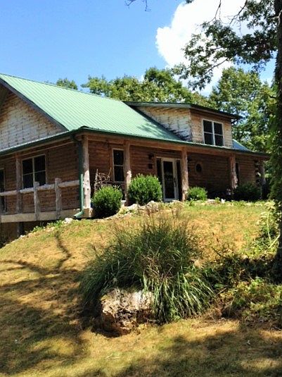Secluded Log home, unique concrete and wood design. The counters and floors are stamped concrete, custom pine cabinets, beautiful wood detail through out. Wraparound porch gives you a 360 view of the true Ozarks. All on 70+/- acres, 4 ponds, workshop, and barn.
