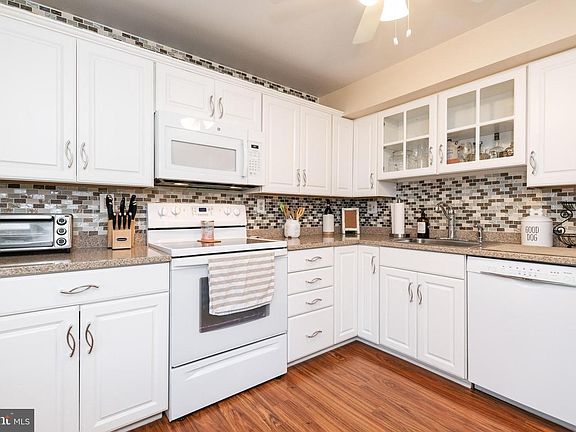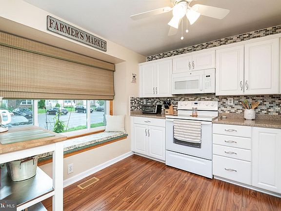 Custom updates throughout! Quartz counters, tile backsplash and lovely window seat in kitchen, NEW hw floors in foyer, powder room and kitchen. Freshly painted interior, crown molding, decorative chair rail, renovated baths and 6 ceiling fans! Finished LL with wood burning FP & half bath. Fantastic faux stone wall in LR with marble inlay in front of French doors to deck. Beautifully landscaped front yard and fully fenced rear yard with storage shed. ROOF JUST REPLACED!