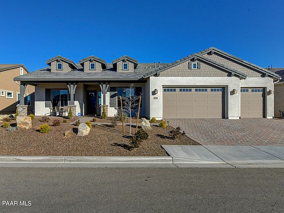 Immaculate move in ready Energy Star rated 2862 sq ft Dorn home in sought after Granite Dells Estates Built in 2021. Boasts 4 bedrooms (master & ensuite) and 3 bathrooms, large 3 car garage. Open concept living plan, including a dedicated dining room, flex space, Great Room with 12 ft ceilings, a gas fireplace with custom stone accent and a gorgeous kitchen with cream cabinets, granite countertops, stainless steel appliance package and an exceptionally large walk in pantry. A spacious master suite has lots of natural light, dual vanities, a garden tub and expansive master shower. Other features include, large paver driveway to the garage, concrete tile roof and post tension slab construction. This premium lot is professionally landscaped and the rear yard has a large covered back patio