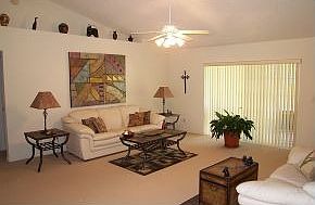 Pride of ownership evident here, immaculately well maintained, please remove shoes when showing. Covered entry, tiled foyer, cathedral ceilings, open, light, & bright. Spacious kitchen with 3 stool breakfast bar and nook. Master bedroom walk-in closet, master bath garden tub and separated tiled shower. Guest bath tub/shower combo. Curbit plant liners all around, garage screened sliders, covered lanai faces very private backyard bermed area with 12 x 16 detached garden tool shed.