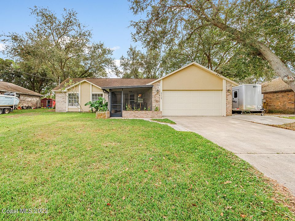 New roof installed before closing! Country vibes in Port St John! After walking in the spacious screened in, insulated panel, front porch you will instantly feel at home in this 4 bedroom home with an updated kitchen with granite countertops, tiled backsplash, under mount stainless steel sink, newer appliances, and dual pantries. Engineered luxury plank flooring throughout the main living areas, tiled bathrooms, and carpet in the bedrooms with 5.25 inch baseboards. Tiled showers in both bathrooms, and an updated vanity with granite countertop in the guest bathroom. Large backyard that is perfect for pets, huge driveway for parking, and even paved boat/rv/trailer parking on the right side of the home. 2017 AC, vaulted ceilings, and ready for a new owner.