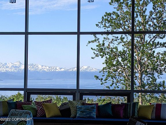 Architect designed to maximize the spectacular view & minimize the barrier between the outside and inside. Quiet and serene neighborhood approx. nine miles from Homer. Kawneer commercial aluminum windows on southside. Radiant heated concrete floors. 3 bed 2 bath home with open floor plan. 4'x10' kitchen island/table. Master suite on one side, 2 guest rooms with Jack & Jill bathroom on the other.All living space on the main floor, cistern and mechanical room in the walk out basement Buderus high efficiency propane boiler. Quadlock insulated foundation, 2x6 construction. 4000+ gallon potable water storage. Large raised Trex deck with glass & aluminum rail. Great yard space with several flower gardens, raised beds for strawberries & vegi's, and a potato patch. Plenty of room to add a greenhouse and a garage/shop.