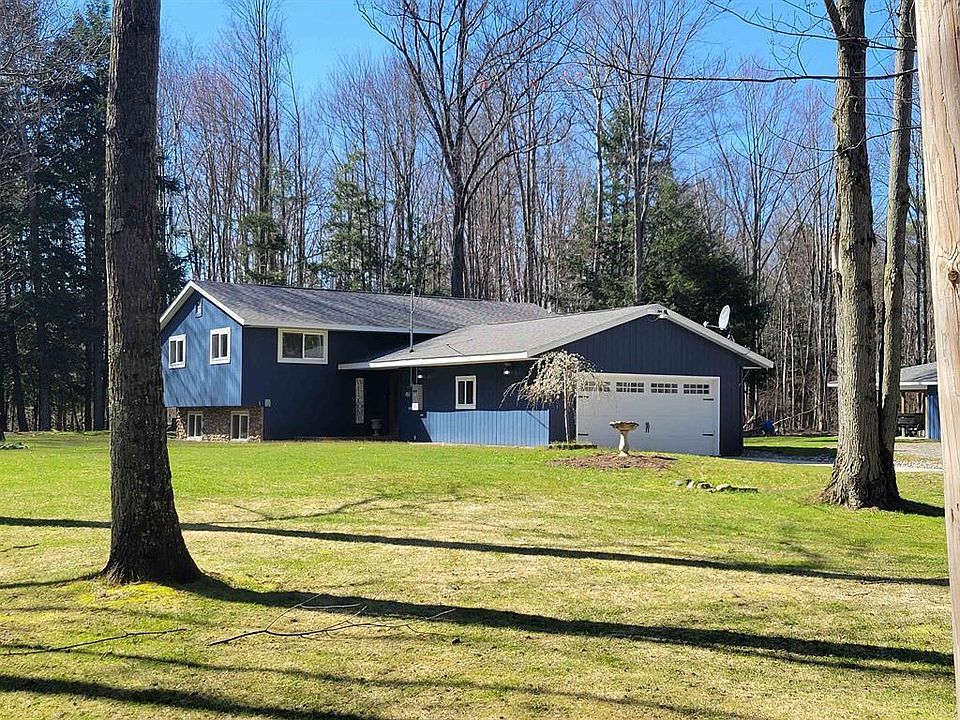 Easy living awaits at this gorgeous home placed way off the road on 15 wooded acres. Traverse the long drive back to the sunny clearing where the meticulously cared for home greets you. A concrete approach to the attached 1.5 car insulated, drywalled & heated garage leads you to the entrance foyer. The roomy foyer has a coat closet and stairs leading you to the main floor and the finished lower level. Begin upstairs where there is new waterproof vinyl plank flooring throughout the main living area. The extra large living room provides comfort & relaxation for the whole family. The dining area opens up to the beautifully updated kitchen with custom hickory cabinetry and Corian countertops. The stunning sunroom can be used all year round as it offers its own heat source. You'll love the windows allowing you to view the acreage & wildlife that call it home. The primary suite will be your oasis at the end of a busy day. Privately located in the floor plan it has its own bath with a shower & a sitting room. Skylights allow natural light to flood in. 2 additional bedrooms are on this level along with another updated full bathroom. The full basement provides an additional 900 sq ft of finished space and has a family room with a cozy reading nook adjoining. Also a 4th bedroom and a bonus room great for a home office or art studio. There is a storage room to keep you organized and a huge laundry room with storage closets galore! A door leads you out to the back yard. Additional features include a Generac whole house generator, wood stove tied into the the forced air duct work for an alternative heat source, 5" well, c/a, Pella windows, updated septic, newer shingles, freshly stained wood siding with shake and stone accents & an owned water softener and propane tank. You'll love the detached pole barn approx 30x40 in size. heated on one side by a wood stove. The large covered overhang has concrete and would be so easy to enclose for additional space. Enjoy the wooded acreage with a small creek offering great hunting!