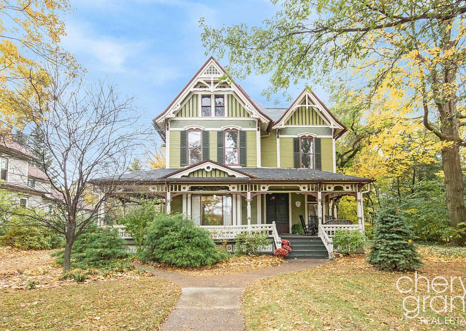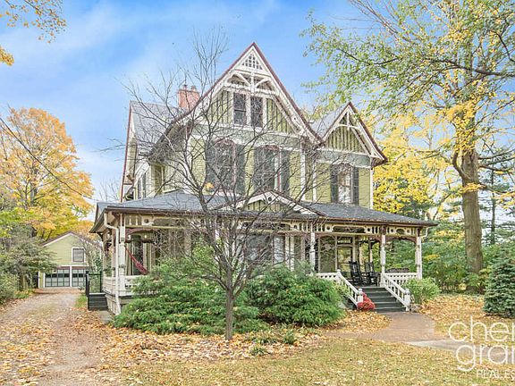 This stunning Queen Anne home is instantly recognizable as one of the crowning jewels of Heritage Hill. Originally built in 1881 as a farmhouse, it was acquired in 1884 by George Davis - co-founder of Stow & Davis Furniture Co. - and remained in his family for 100 years. Davis transformed it into a showcase of impeccable design by adding hand-carved mahogany mantels and bookcases, a stunning, walnut staircase, Mission-style oak paneling, and custom stained glass. This elegant craftsmanship remains intact today, with original hardwood flooring, 10-foot pocket doors, 11-foot ceilings, and a welcoming wrap-around porch, all situated in a peaceful, park-like setting. At 1/2 acre the home sits on the second largest lot in Heritage Hill. Features: 5 bedrooms with potential for 6, 3 baths, light-filled living room, parlor, ample dining room, kitchen with butler's pantry, sunroom overlooking the garden, carriage house with loft, gravity AC.