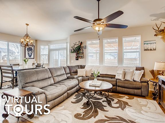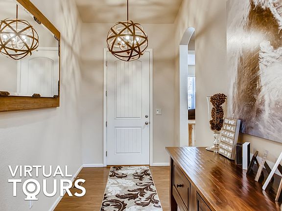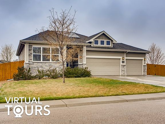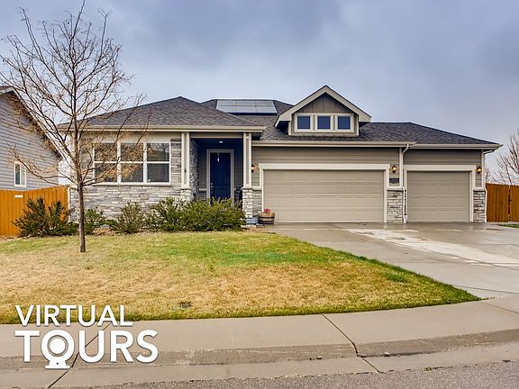 Mountain views from this move-in ready 3 bd / 2 ba home with an open layout, 8 foot tall doors throughout, spacious backyard with hot tub, and solar! Pass the front lawn and stone exterior on your way inside, where you're met with hardwood floors, vaulted ceilings, and plenty of natural light. The main living space offers a chandelier lit dining area for dinner parties, and a kitchen fit for any chef, equipped with granite countertops, stainless steel appliances, tile backsplash, and a center island with seating. Two sets of sliding glass doors, one in the primary suite, lead to the backyard, complete with a partially covered stamped concrete patio, lawn, and trees along the privacy fence. When it's time to wind down, opt for any one of the comfortably carpeted bedrooms; the primary has a walk-in closet and ensuite bath, with a dual sink vanity, glass enclosed shower, garden tub, and water closet, while the secondary bedrooms share the full hallway bath. Other features: Central A/C and Forced Air heating; Storage in the laundry room and 3-car garage; New roof and exterior paint; Energy efficient appliances; Double pane windows; Sprinkler system. Located near Frederick with shopping and dining, parks, and trails, with easy access to Rt. 52, I-25, and Denver! Buyer should verify all information.