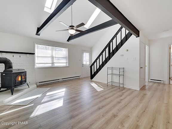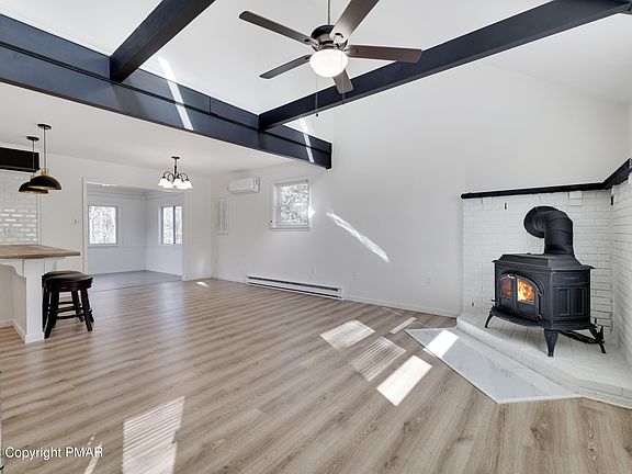 Beautiful AirBNB friendly, open-concept Mountain Contemporary with 3 bedrms & 2 full baths. 4-season Rm with huge windows all around and a wood stove in the living room that makes the entire house toasty. Dazzling chevron wooden countertops and new flooring thruout. Two tiered deck out back leading to a firepit. So much potential with so many options; Vacation home, short term rental, long term rental or primary home. New Septic Tank. New Water Heater. New Stainless Steel appliances. Gated community with 5 lakes, beaches, 2 outdoor pools, basketball courts, tennis courts, playground and clubhouse. Close to so many attractions- Pocono Raceway, Kalahari, Camelback Ski Resort, Premium Crossing Outlets and more! Schedule your showing today.