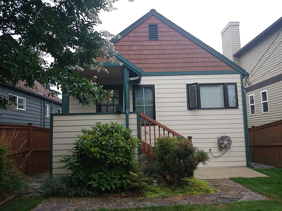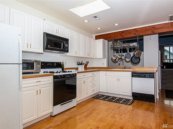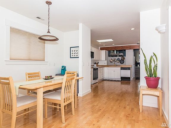 Thoroughly remodeled home, newer two car garage, five steps up living room addition, light filled, cathedral ceiling. Maple floors enhanced by lots of day light. Gas range, breakfast bar / work station, great town house alternative. Lower level Approved ADU (Not a duplex) or use as a large master bedroom, gas fireplace adds to ambiance. Deck on sunny side. 60" tv included. Two additional parking spots in front of two car garage. Close to Phinney Ridge's Restaurants and blocks to Green Lake.