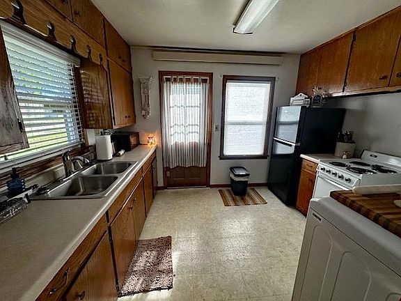 Cozy 2 Bedroom 1 Bath home. This home has vinyl siding and seamless gutters. Big back yard with alley access. Nice-sized living room/dining room, kitchen with laundry facilities. All appliances stay. Cove radiant heat and window a/c. Roof is 8 years old. Everything you need is on one floor, great starter home or investment property!